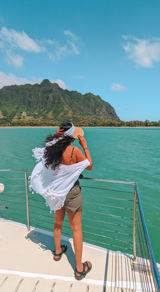 On my second trip, I did the Ocean Voyage which is a 90 minute tour mostly on a boat. The first portion takes you on a small boat through a fishpond to Secret Island where you board a larger Catamaran for a cruise around Kāne`ohe Bay. You get close to the iconic Mokoli`i Island (Chinaman’s Hat) and can spot some turtles in the water along the way. We went with this tour option because it was family-friendly as well as infant friendly. Other infant-friendly activities include Secret Island Beach Activities, Ocean Voyage Adventure Tour, the Aloha ‘Aina Tour, and the Hollywood Movie Sites Tour. Be sure to prebook the activity you wish to do! Kualoa has some really good food if you want to grab lunch after your activity.
